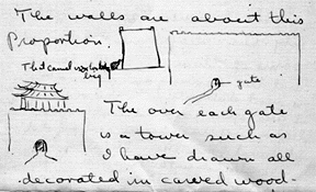 It makes me sick that I didn't get a costume for Eunice that I saw in Peking. It was keen. and she could surely have used it. It is too bad Don didn't get his master's degree or Sigma Xi because in the long run dislike of a certain professor is an incident while an honor like that is an important item. That certainly is good news about the dresses. I can certainly use them. And so Pansy got married. I hope she will be happy. She is such a capable housekeeper that I think she will get a big kick out of having her own home. And "mother" wasn't there to boss the wedding. I am glad and relieved to know that that package with the brocade arrived o.k. I forgot to insure it. I feel as though I ought to tell you more about Peking, but all I saw was the shops. I didn't get out to the Drum Tower or the Temple of Heaven or the Winter Palace or any of the Lama temples. But I can find my way about now so if I go up later to visit some friends I can go by myself. I had tea with Mr. and Mrs. Nelson at the Grand Hotel des Wagon-Lits. They left that night for Sezchwan province to hunt for Archaelolgical remains. Mr. and Mrs. Walter Granger went also they will search for fossils. Sezchuwan is the remote province on the headwaters of the Yangtze River and borders on Tibet. They expect to be gone all winter and then return in the spring to join the 3rd Asiatic Expedition on the trip into Mongolia. The walls around Peking are so massive. First we passed through the outer wall then under huge arches or gates into the inner city and then there are walls and walls inside the inner city. The walls are about this Proportion.